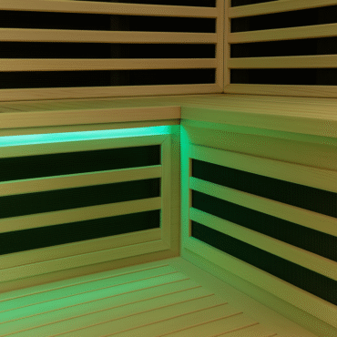 The infrared carbon heating panels, seamlessly built behind finely crafted wood slats and highlighted by ambient green LED lighting, deliver uniform, energy-efficient radiant heat for rapid warm-up and stable temperature control. This integration of advanced heating technology with refined wood craftsmanship enhances both the functionality and aesthetics of the sauna, creating a premium wellness environment.