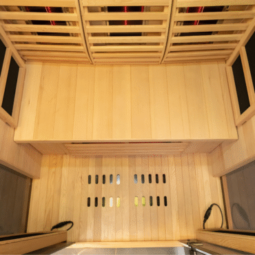 The sauna base features a solid wood floor with a natural grain, offering stability and durability. Strategically placed ventilation slots promote air circulation and balanced heat distribution, ensuring a more comfortable environment. Combined with the concealed lower heating system, it delivers full-body warmth from the ground up for a more consistent therapeutic experience.
