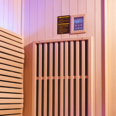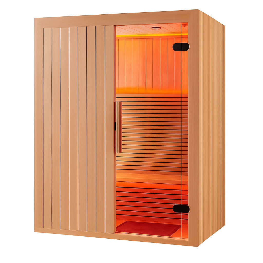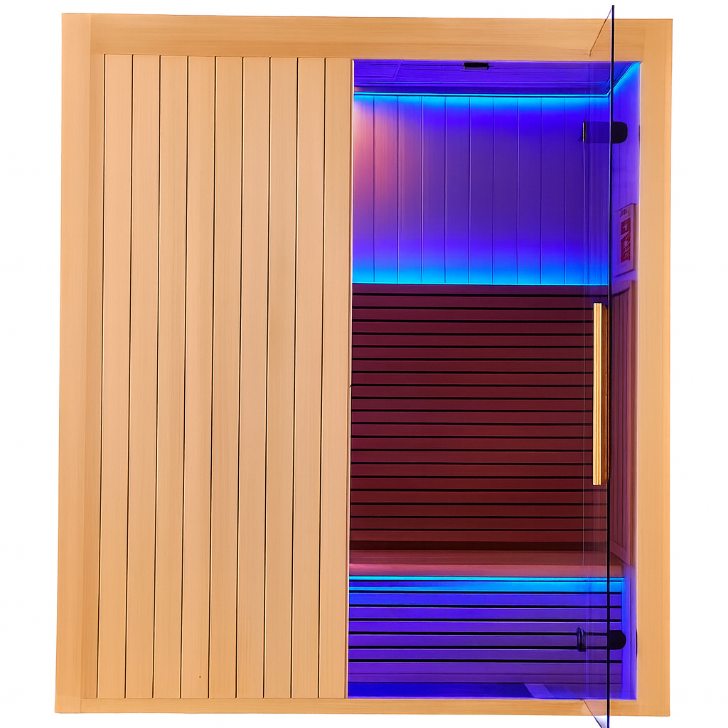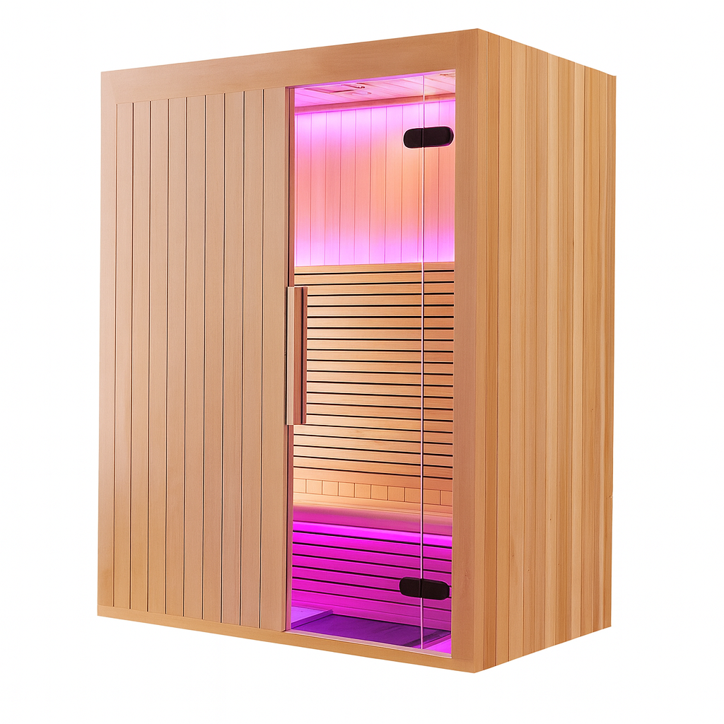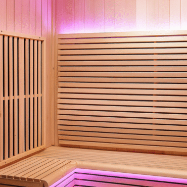 Inside this sauna corner, the Canadian Hemlock wood panels and ergonomic bench backrest create a natural, durable, and elegant seating area. The hidden infrared heating elements behind the finely spaced slats deliver gentle, even heat that supports detoxification, muscle relaxation, and stress relief. Accented with soft LED mood lighting, this design blends modern infrared therapy with a warm, spa-like atmosphere—perfect for home sauna, wellness studios, gyms, and spa facilities seeking both style and performance.