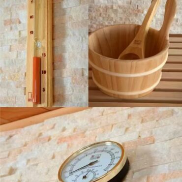 A wooden sand timer, thermometer-hygrometer, and traditional bucket with ladle provide precise time control, accurate temperature-humidity monitoring, and convenient steam generation, ensuring a safe, authentic, and enjoyable sauna session.