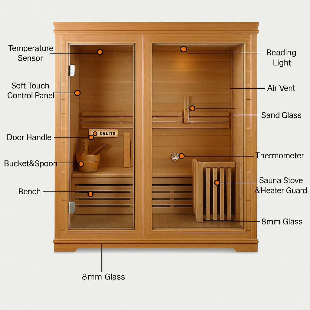 Accessories Included | Sand Glass、thermometer、sauna stoves、wooden bucket and scoop、Reading Light、Soft touch control panel |
