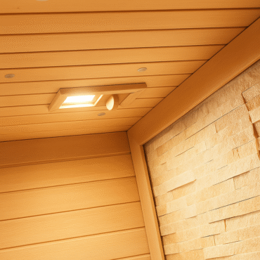 This detail image highlights the sauna’s ceiling with integrated lighting and ventilation system. The soft, warm light creates a relaxing atmosphere, while the built-in vent ensures continuous air circulation for fresh and comfortable sessions. The seamless wood finish adds to the natural and elegant design of the sauna.