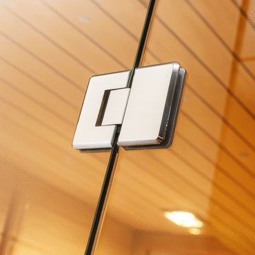 This close-up detail showcases the tempered glass door hinge of the sauna. Crafted from high-quality stainless steel, the hinge provides durability, stability, and smooth operation. Its sleek, modern finish complements the transparent glass design, ensuring both safety and elegance in the sauna’s construction.