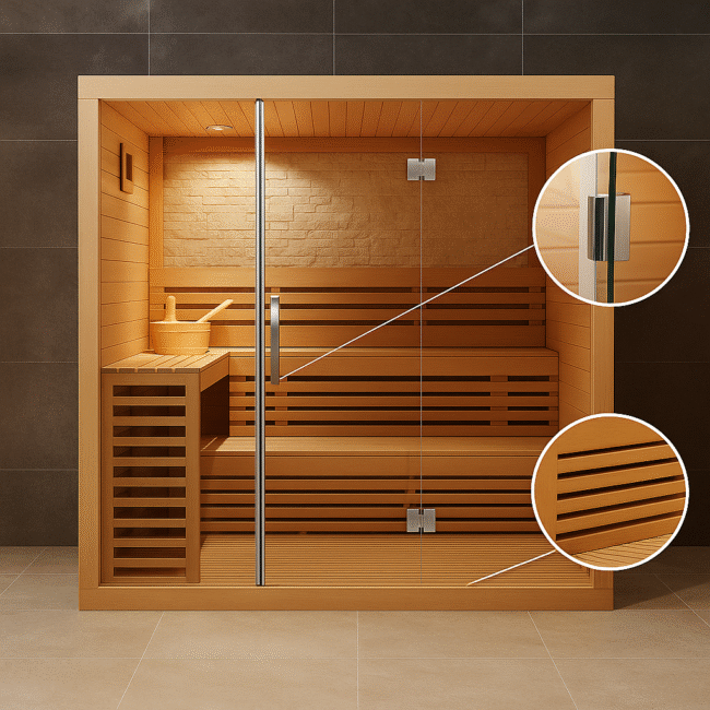 This close-up detail showcases the tempered glass door hinge of the sauna. Crafted from high-quality stainless steel, the hinge provides durability, stability, and smooth operation. Its sleek, modern finish complements the transparent glass design, ensuring both safety and elegance in the sauna’s construction.