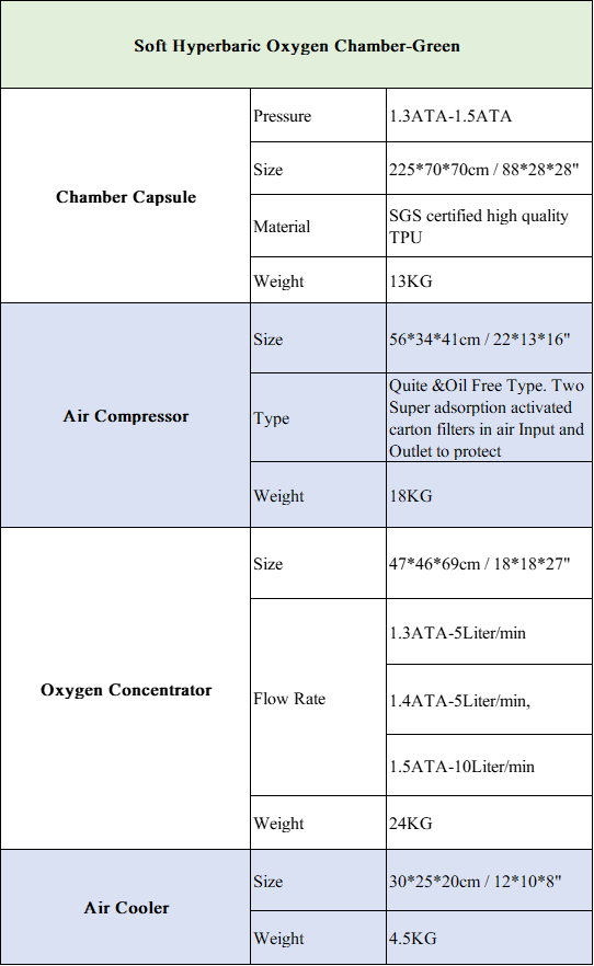– Pressure: 1.3/1.4/1.5 ATA, safe and suitable pressure, not high to harm our body, not low less effective.