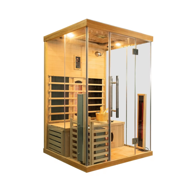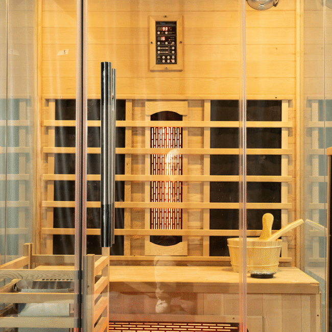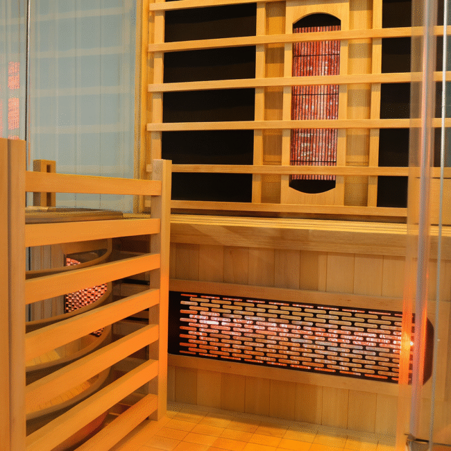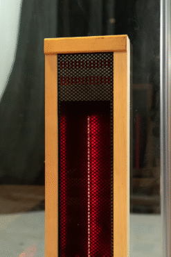 This close-up highlights the vertical carbon infrared heater encased in a sturdy wooden frame with protective mesh. It delivers steady, penetrating warmth for efficient detoxification and muscle relaxation, while the reinforced guard ensures safe operation and long-term durability—ideal for a comfortable and worry-free sauna experience.