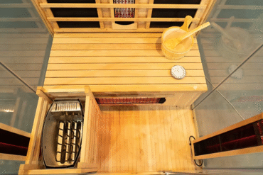 This interior close-up showcases a traditional sauna heater with stone basket paired with infrared panels, delivering dual heating for customizable steam and dry sauna experiences. The solid-wood bench, water ladle, and built-in thermometer complete the authentic spa setup, ensuring efficient heat distribution and a safe, relaxing environment.