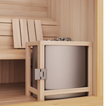 This close-up highlights the premium sauna heater encased in a sturdy natural-wood guard. The round stainless-steel stove is packed with heat-retaining stones to ensure fast, even heating, while the precision-fitted wooden frame adds both safety and aesthetic harmony. Ideal for delivering consistent steam and authentic Finnish sauna warmth, it perfectly matches the overall minimalist design of the sauna room.