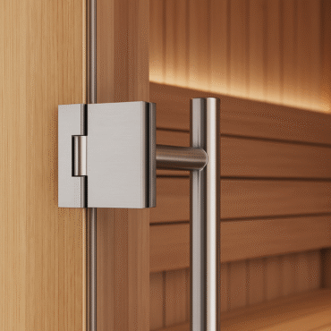 This sauna room features premium glass door hardware with a solid stainless-steel hinge and a sleek vertical handle. The brushed metal finish resists heat and moisture, ensuring long-term durability, while the precise alignment enhances smooth door operation and modern visual appeal.
