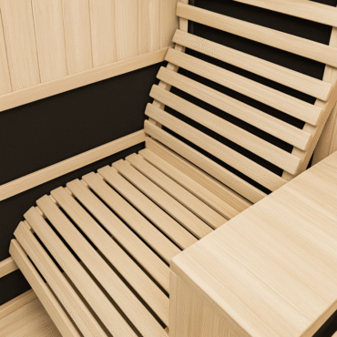 This overhead view highlights the sauna’s extended lounger-style bench, crafted from premium natural wood with finely polished slats. The elongated, gently contoured design supports full-body stretching, ensuring maximum comfort during long heat sessions. Beneath the seat, hidden infrared panels provide even, efficient warmth, while the smooth grain and sturdy framework guarantee durability and a refined aesthetic.