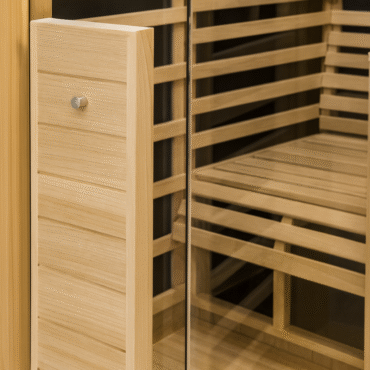 This detail highlights the sauna’s sturdy solid wood door frame, featuring precise joinery and natural wood grain for lasting strength and a warm, inviting appearance. The refined finish ensures durability and blends seamlessly with the overall sauna design.