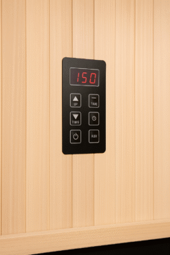 The built-in digital control panel offers precise temperature and time settings with simple touch-button operation. Its sleek black design contrasts beautifully with the natural wood, ensuring both modern style and effortless control for a seamless sauna experience.