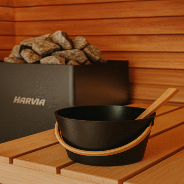 A stone accent wall adds a modern, high-end touch, while the traditional sauna bucket and ladle provide easy control of steam levels for both dry and wet sauna sessions. On the side, a professional-grade sauna heater offers fast heating and stable temperature maintenance.