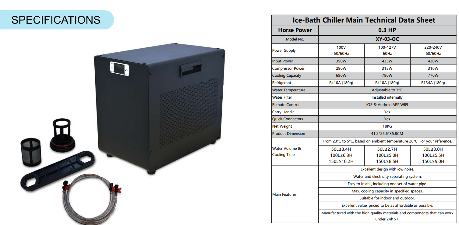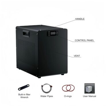 The front design of Small Home Use 0.3HP Ice Bath Chiller combines simplicity and modern aesthetics, featuring a sleek, tech-inspired appearance that reflects its superior quality and professional performance. Perfect for both residential and commercial use, this chiller integrates seamlessly into any environment, redefining efficient cooling.